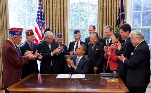 “President Barack Obama and his guests applaud after signing S.1055, a bill to grant the Congressional Gold Medal, collectively, to the 100th Infantry Battalion and the 442nd Regimental Combat Team, in recognition of their dedicated service during World War II, in the Oval Office, October 5, 2010. (Official White House Photo by Pete Souza)”