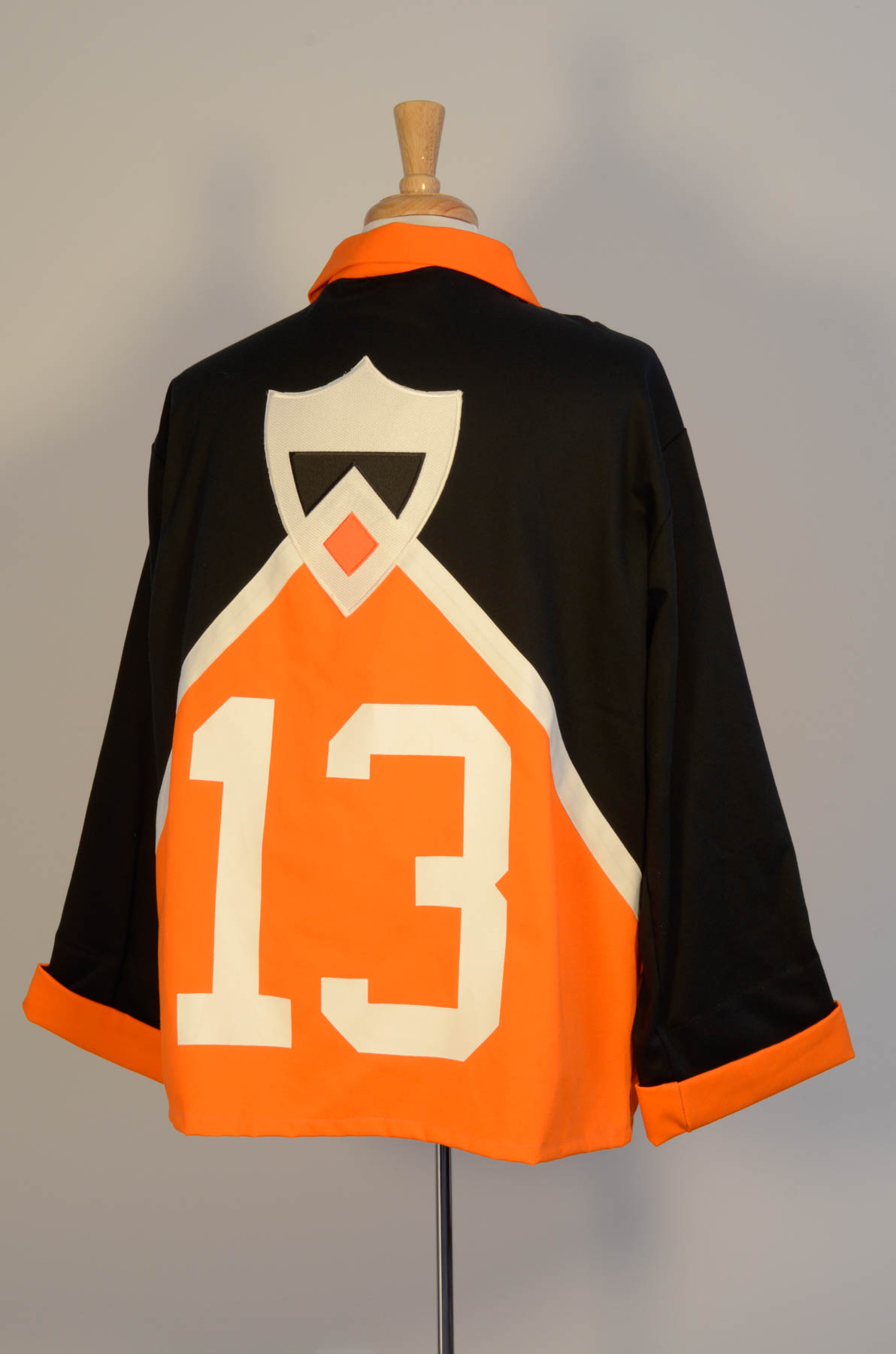 Windbreaker in orange, black, and white fabrics with silk-screened and embroidered decoration.