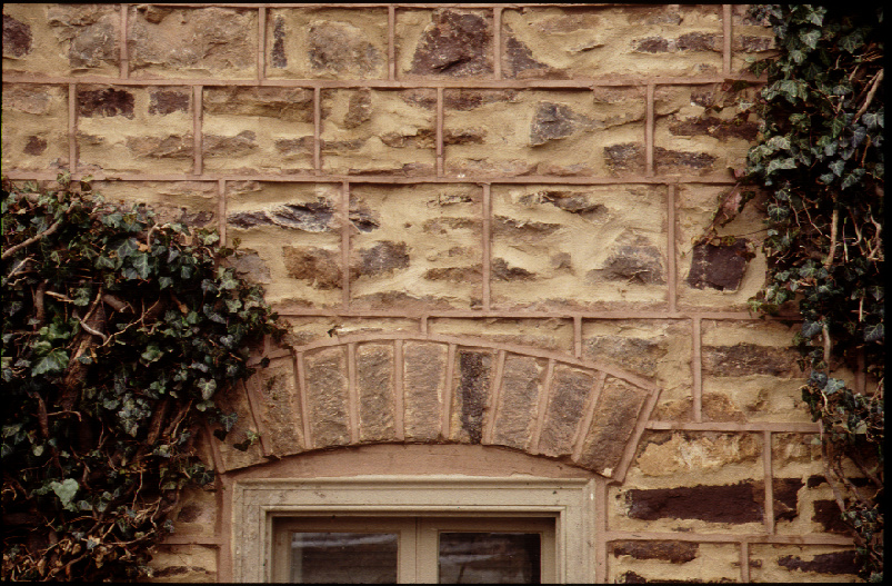 Both buildings were executed in "Stockton sandstone" to match the walls of Nassau Hall. The masonry