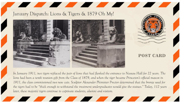 The following "postcards" are sent monthly to alumni all over the world to keep them engaged and close to Princeton. This project is a joint effort by the Alumni Council’s Princetoniana and Communications and Technology (CAT) Committees. Go here for further details.